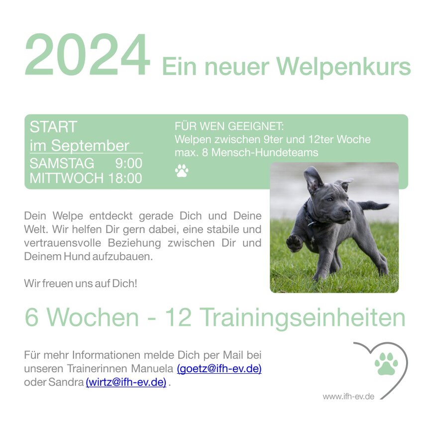 NEU ab September!!! Dieser Welpenkurs wird von unseren Trainerinen Manuela und Sandra angeboten. Weitere Infos findet ihr auf unserer Homepage unter Welpenstunde.